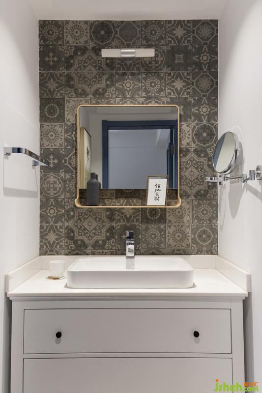 衛(wèi)生間干區(qū)用水泥色花磚做了背景,使得每天的洗漱和化妝多了份看點,金色鏡子也顯得比較洋氣。