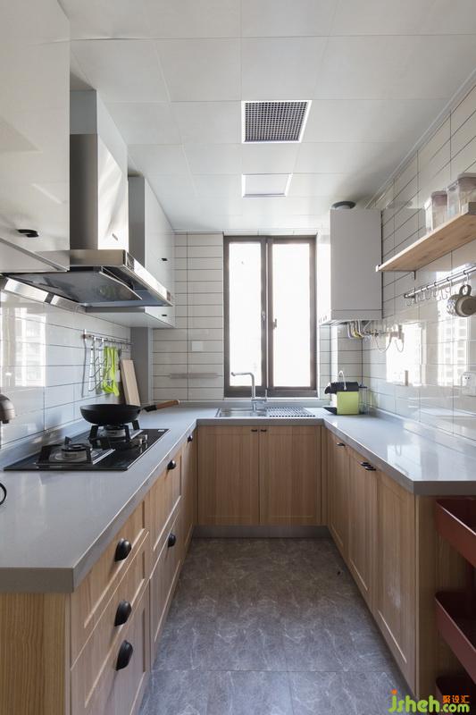 室內(nèi)設(shè)計師在廚房延用了小白磚與木色櫥柜的搭配,簡潔質(zhì)樸,滿足功能即可。