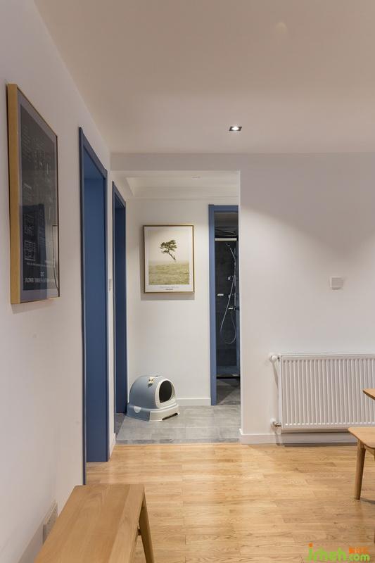 藍色的貓砂盆很可愛,精美的掛畫給空間帶來了一抹綠。