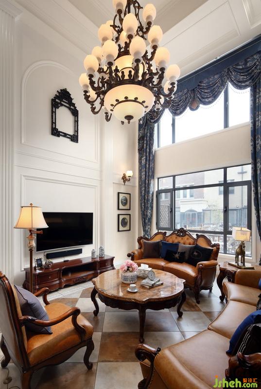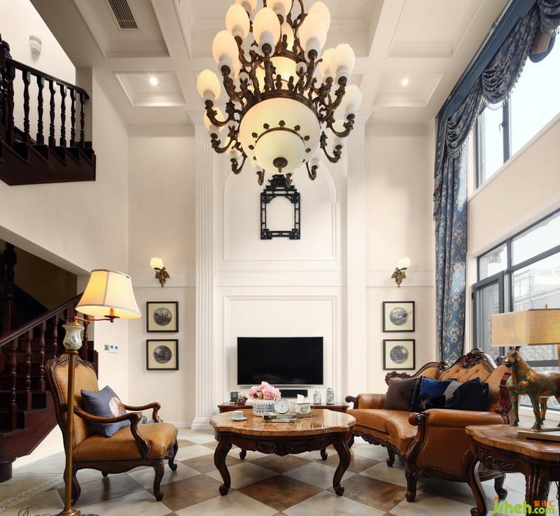 這是一套四層的美式別墅,挑高客廳在吊燈的照射下奢華大氣。白色護(hù)墻板從地到頂,與暖色的墻面很協(xié)調(diào)。精致小巧的裝飾畫起到點(diǎn)綴作用。
