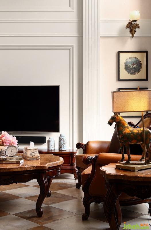 護(hù)墻板頂上的裝飾物精致,有種莊重的感覺。室內(nèi)設(shè)計(jì)師挑選胡桃木的家具木紋精雅別致,優(yōu)雅大方,電視柜、茶幾和沙發(fā)步調(diào)一致,粉色的插花給整個(gè)環(huán)境帶來一絲溫柔。