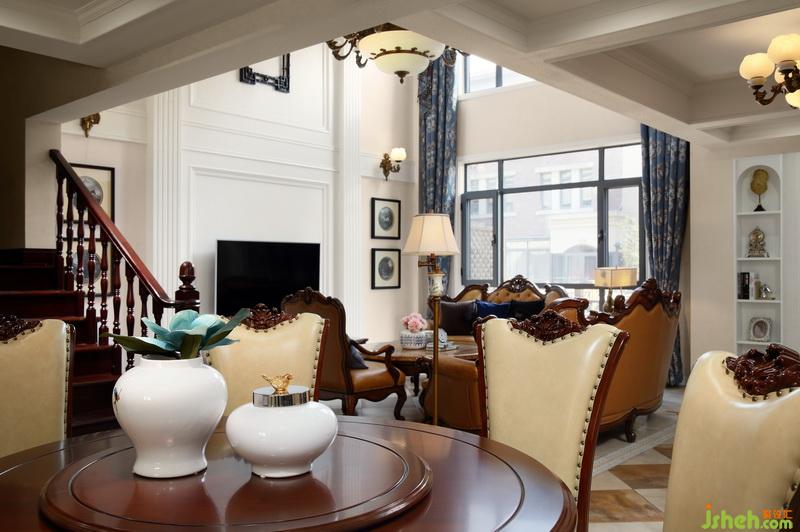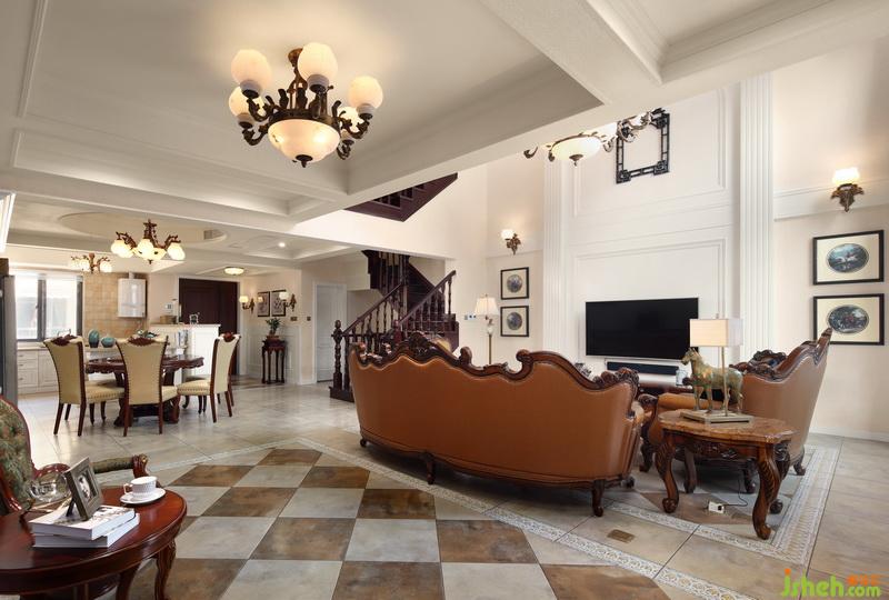 室內(nèi)設(shè)計(jì)師在客餐廳地面搭配了美式味道的仿古磚,通過吊頂?shù)膶哟巫兓瘎澐殖霾煌瑓^(qū)域。開放式的廚房使得一樓空間光線通透,透露出古典的美式味道。