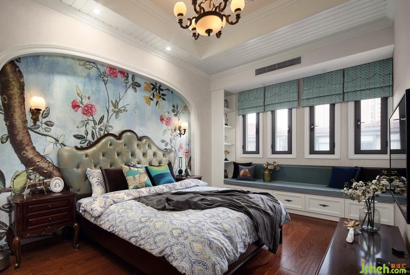 臥室把中西方兩種風(fēng)格交織融合,墻壁上的中國(guó)畫很搶眼,在拱形墻洞的包裹下非常別致。飄窗很長(zhǎng),增加了不少收納空間,與寶藍(lán)色窗簾的搭配,增添了層次感。