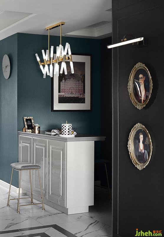 這是一套現(xiàn)代輕奢混搭的作品,濃郁但又不失生機(jī)的墨綠色,是一種獨特而又復(fù)古的色調(diào),恰到好處的介于復(fù)古和時尚之間,給整個屋子帶來一種時髦韻味。進(jìn)到屋內(nèi),眼前是吧臺和過道,左手邊餐廳,右手邊客廳,視線很開闊,光線通透明亮。剛進(jìn)門看到的灰色吧臺,這處原本是一面墻,看上去堵得慌,把墻拆掉后做了吧臺,讓我們的視線增加了延伸感。吧臺的設(shè)置為家里添加了一處休閑區(qū),可以在這里喝到回到家后的第一杯飲品,也是朋友間盡興夜談的一處佳境。