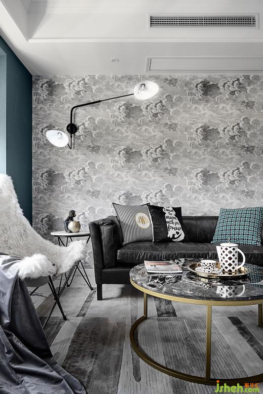 沙發(fā)背景是一款網(wǎng)紅的烏云壁紙,灰色與墨綠色撞色更顯時尚感。條紋地毯的不規(guī)則深淺變化,為整屋平添一份藝術(shù)氣息。室內(nèi)設(shè)計師在沙發(fā)旁的邊柜選用黑胡桃有種深沉、華貴的感覺,它的結(jié)構(gòu)、功能和造型本身就設(shè)計感十足,可以提升整屋的品味。金色的幾何形裝飾掛件起到了點綴作用,是現(xiàn)代與時尚的融合。