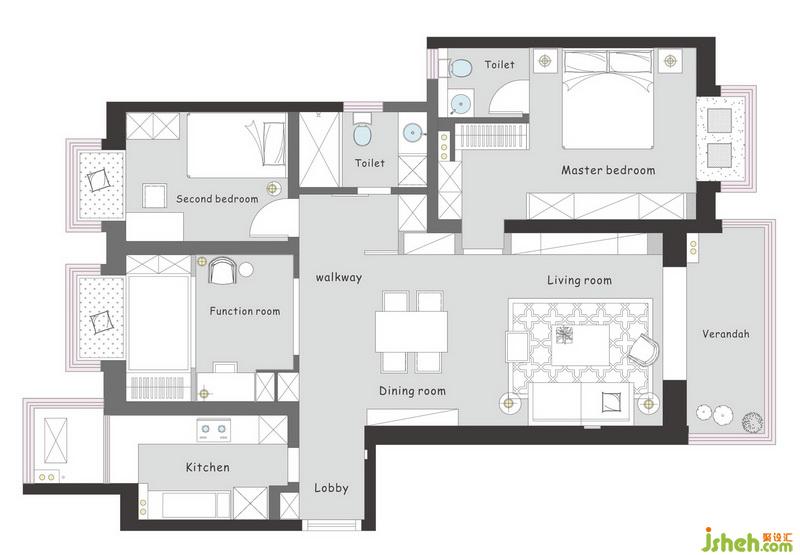 這是一套南北通透性好,比較規(guī)整的戶型。室內(nèi)設(shè)計師將朝北的一間房設(shè)計為書房、榻榻米和收納兼具的多功能活動空間,釋放了家里空間的合理利用率。在主衛(wèi)的位置,縮小了它的空間,省去了洗浴功能,增加了主臥的收納空間,次衛(wèi)的洗浴功能完全可以滿足三口之家的需求。陽臺沒有像傳統(tǒng)家居那樣放置洗衣機(jī)、烘干機(jī)和水池,而是作為客廳的延伸,成為單純的休閑區(qū),恰恰反映出這是一個會享受、愛生活的小小家。