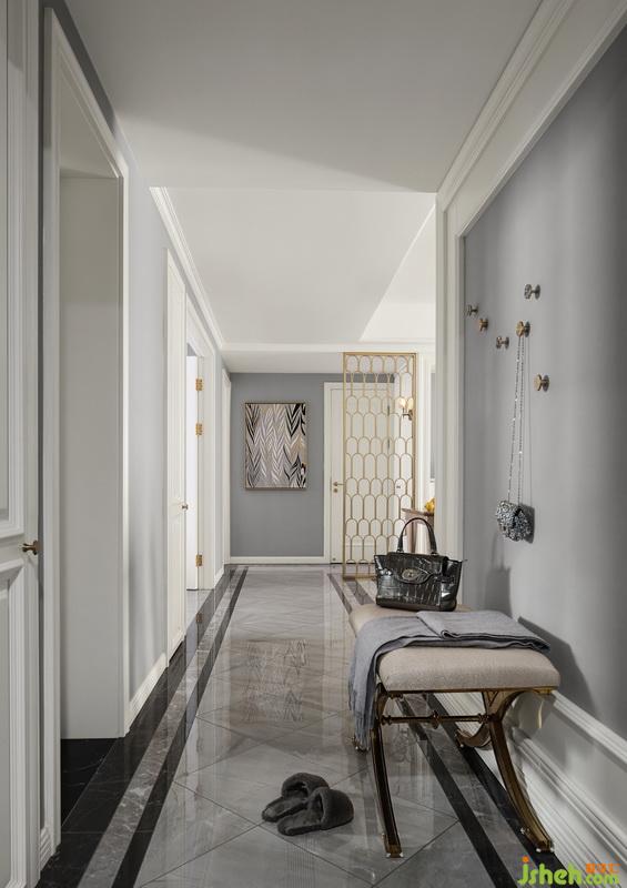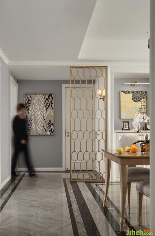 過道的盡頭掛了抽象油畫,我們回到家之后多了一份看點,增加了家里的藝術(shù)氣息。金色隔斷的設(shè)置,使得空間格局更加完整,也為家里增添了一處景致。