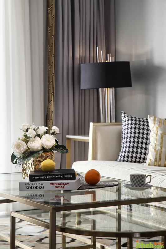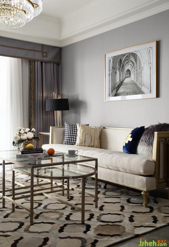 茶幾是美克美家的款式,造型比較特別,由一個長方形和兩個半橢圓形組合而成,透過玻璃面板,豐富的層次感躍然于眼前。