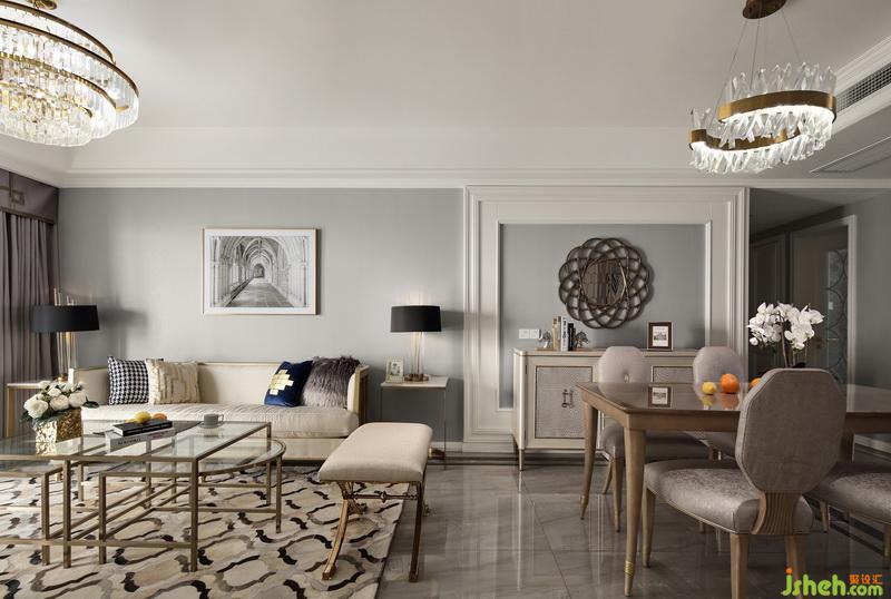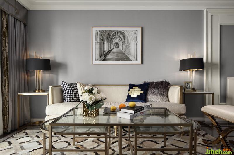 室內(nèi)設(shè)計師在客廳墻面鋪滿了灰色的墻紙,灰色低調(diào)、沉穩(wěn),可以更加襯托出整體家居的色彩感。輕奢的復(fù)古掛畫,體現(xiàn)了業(yè)主的藝術(shù)品位。黑色與金色結(jié)合的臺燈,給家里帶來優(yōu)雅與精致的生活品位。