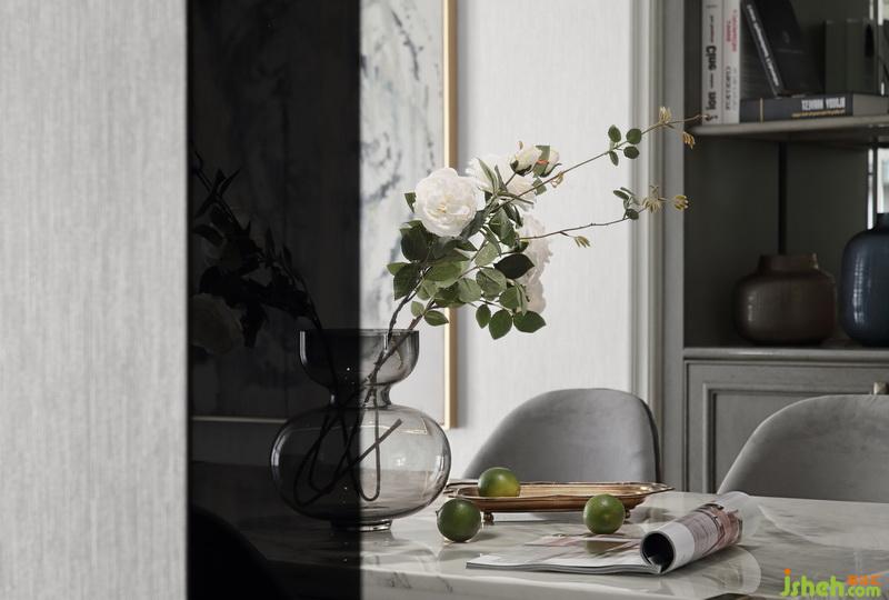 透過鏡面看到餐桌上的玻璃花器,時髦的煙灰色,集美貌與質(zhì)感并存,搭配幾支花藝,不落俗套,優(yōu)雅且有張力。