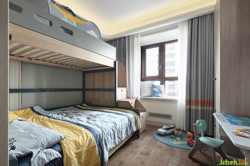 兒童房的主人是一位還在上幼兒園的男孩,上下鋪的床可以給孩子構(gòu)建一個快樂的小天地,陪伴孩子快樂成長,給孩子的青春童年創(chuàng)造一段留戀的時光。室內(nèi)設(shè)計師使用卡通的床品不僅可以給孩子增添樂趣,也有助于更安心的睡眠。