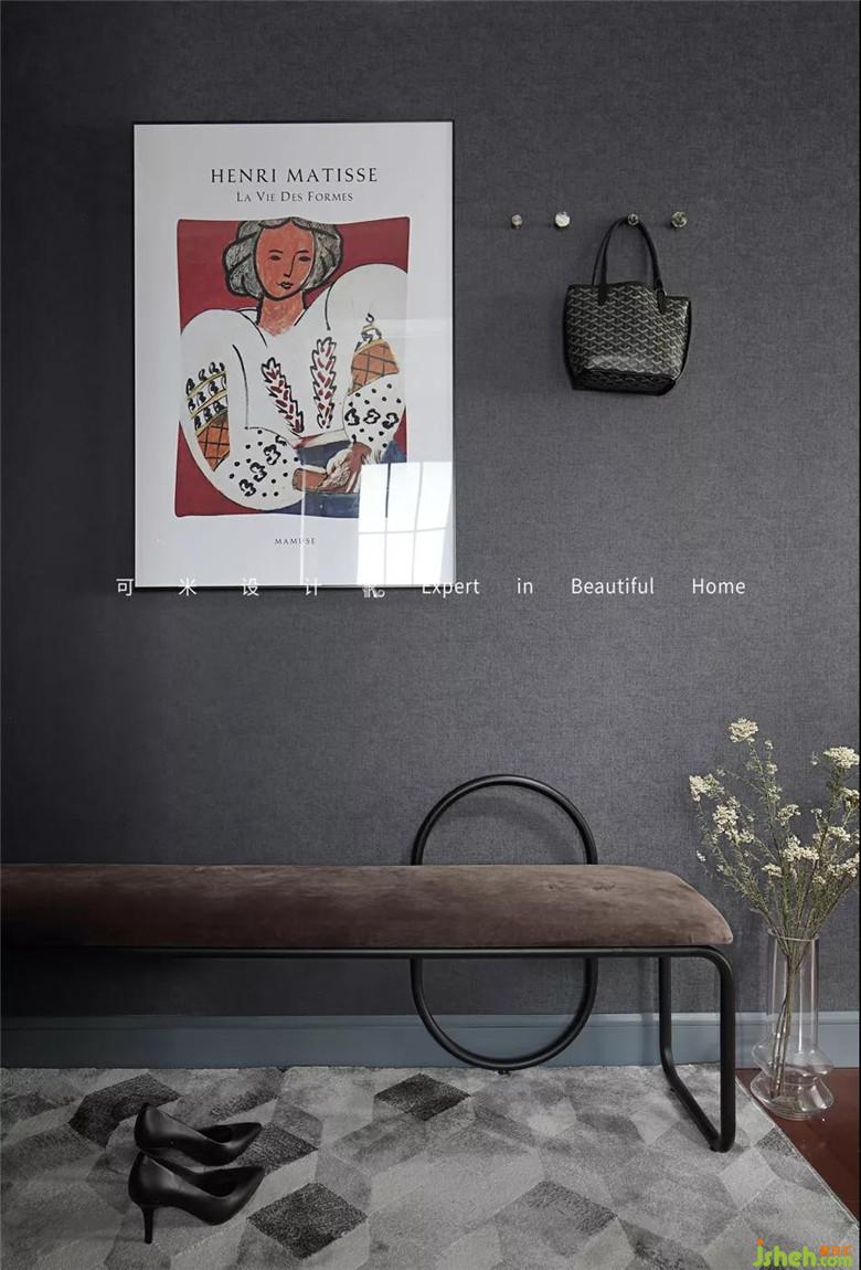 打開(kāi)門(mén)進(jìn)入玄關(guān),一副復(fù)古掛畫(huà)映入眼簾,就像是游動(dòng)在墻上的藝術(shù),看到它使我們疲倦的內(nèi)心一下放松了許多,又恰到好處的遮住了配電箱,營(yíng)造出最美好的玄關(guān)一角。兩大兩小的掛鉤簡(jiǎn)約而精致,方便我們的同時(shí)也輕松地裝飾了墻面。換鞋凳造型時(shí)尚,顏色與整體色調(diào)相匹配。地上放了一塊黑白灰組合的多邊形地墊,顯得時(shí)尚又高級(jí)。裝修公司