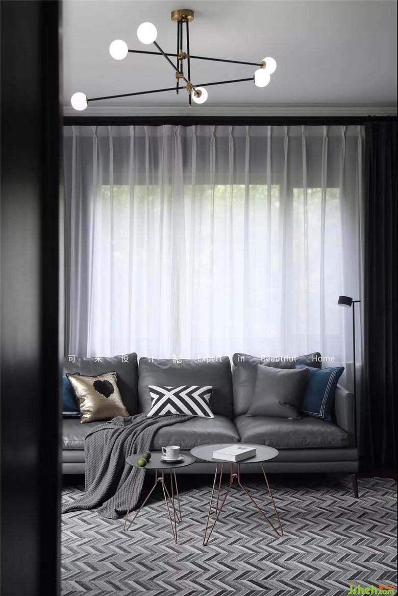 客廳居中放置了三人座的灰色皮質(zhì)沙發(fā),時(shí)尚有范。沙發(fā)背后是一個(gè)大窗戶(hù),安裝的是落地簾,光線透過(guò)細(xì)細(xì)的薄紗照射進(jìn)來(lái),明亮的光線能成功打破屋內(nèi)的暗色,給人一種明快的感覺(jué)。地上搭配了黑白灰的魚(yú)骨造型地毯,增加了視覺(jué)的延伸感。