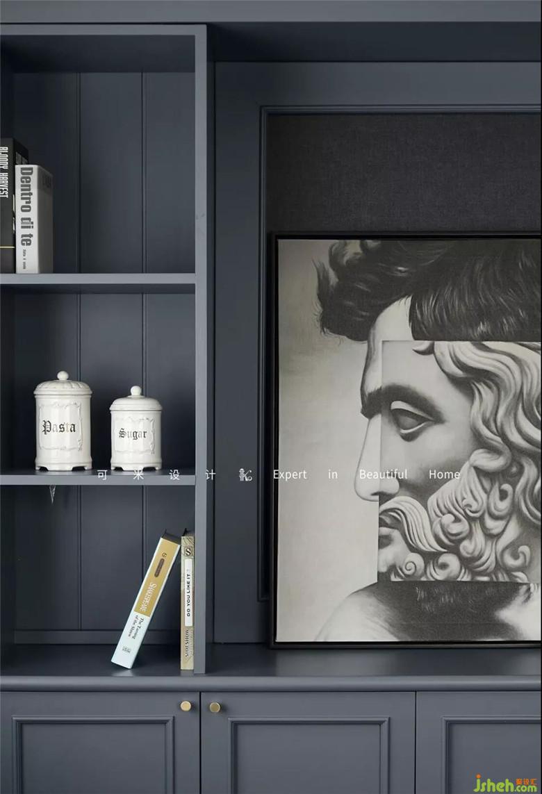 茶幾是直徑50公分和40公分的大小號(hào)組合在一起的,高低相差5公分,黑色與香檳色的搭配,整體顯得很有氣質(zhì)。在側(cè)面定制了灰色的裝飾柜,與整屋色調(diào)相融合,集裝飾和收納功能于一體。復(fù)古的抽象人物裝飾畫(huà),給空間增添了藝術(shù)氣息。裝修公司