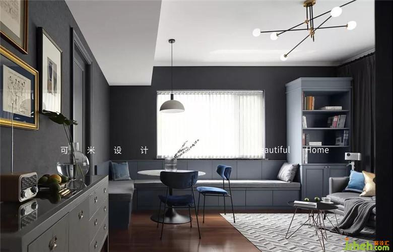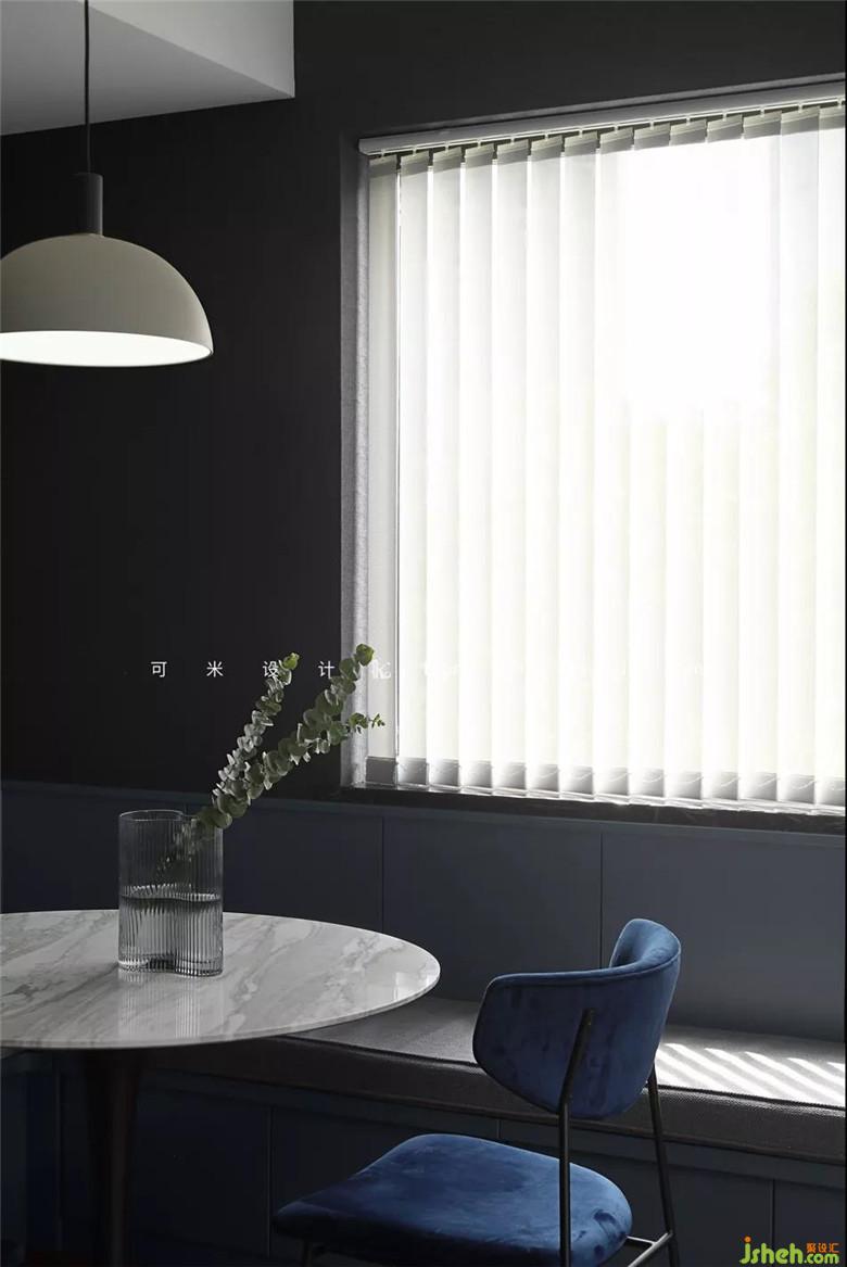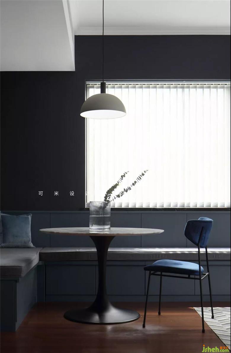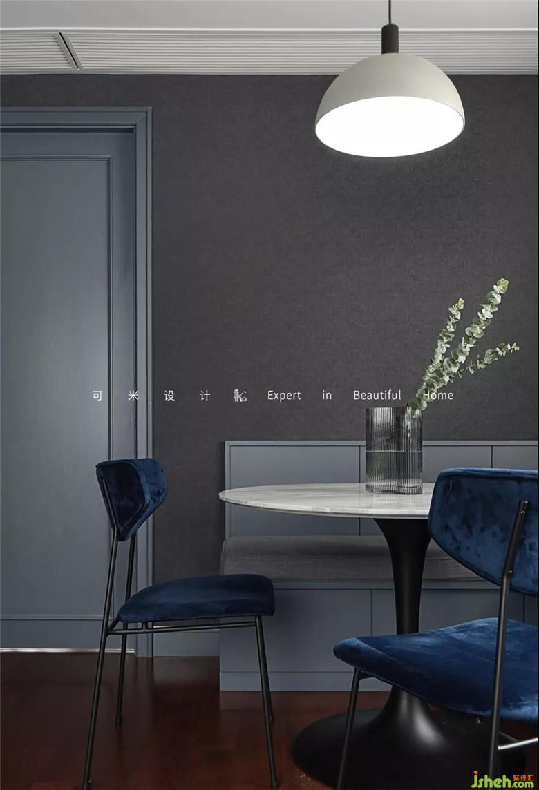 餐椅挑選了高級的寶藍色,顏值高,坐墊是絲絨的,既有舒適性又有設計感。墻面都是貼的深灰色墻布,門和屋內(nèi)柜體的顏色定制的都是灰色,保證了整屋色調(diào)的統(tǒng)一,搭配在一起使整屋充滿高級和時髦感。