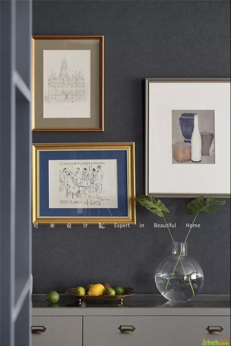 灰色的餐邊柜通過挺拔纖巧的線條,嚴密完整的細節(jié),向我們呈現(xiàn)出懷舊復古的理念。精致小巧的收音機,萌趣感十足。不同規(guī)格的幾幅裝飾畫搭配在一起,為空間增添了文藝復古范。