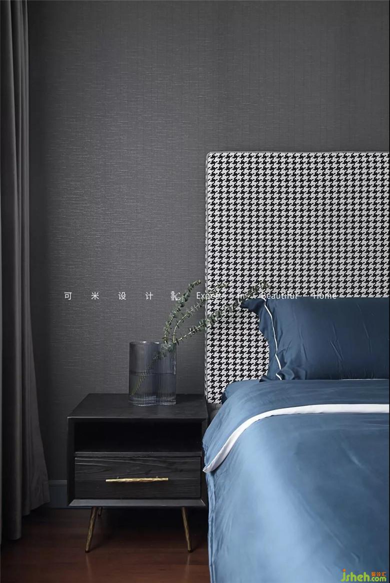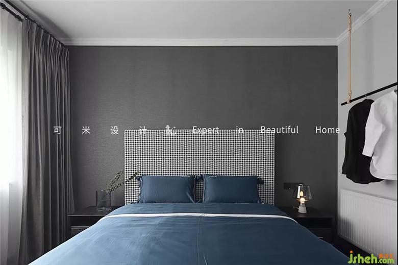 主臥的床頭背景延續(xù)了客餐廳的灰色墻布,配上了千鳥格的大床,千鳥格的圖案是英國貴族的最愛,散發(fā)出復古雅致的韻味,搭配上夢藍色的床品,盡顯高貴氣質(zhì)。房間的一側(cè)安裝了一字掛桿,長度1米,不占空間,簡約美觀,感受高品質(zhì)的收納體驗。