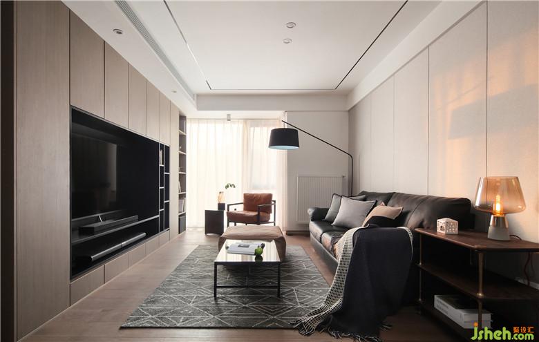咖灰色與黑色交替的電視機(jī)背景墻,將開(kāi)放式與封閉式收納相融合,既能保證足夠的收納空間,又使得整體美觀(guān)大方。