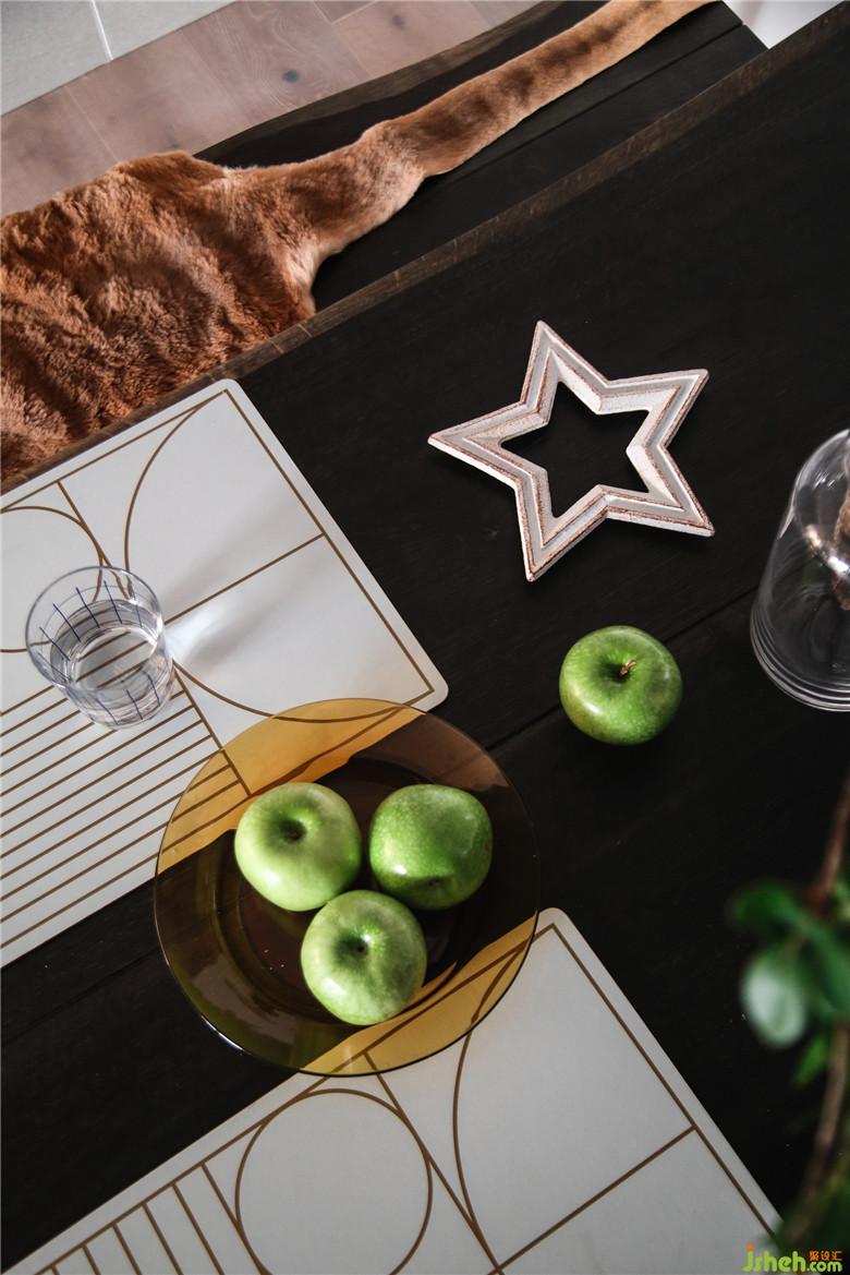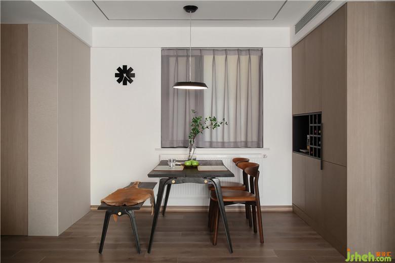 餐廳一側(cè)定制的咖灰色柜子,冰箱嵌入其中,空間上更加規(guī)整;中間做黑色鏤空,用來(lái)放置紅酒和一些裝飾物。裝修公司在對(duì)面的墻體做了淺咖灰色的護(hù)墻,一深一淺相呼應(yīng)。餐桌、椅子與條凳的組合,簡(jiǎn)約中散發(fā)一絲復(fù)古韻味,在條凳上鋪上一塊皮毛墊,恰巧為空間注入一份溫情。黑色的風(fēng)車(chē)掛鐘,充滿(mǎn)時(shí)尚與創(chuàng)意,起到了點(diǎn)綴作用。