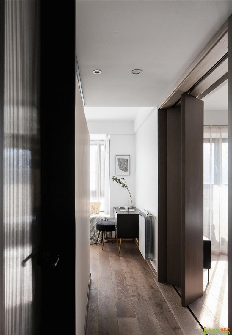 過(guò)道的左手邊是衛(wèi)生間的進(jìn)門(mén),配上了集“透光+隱私+美感”于一身的長(zhǎng)虹玻璃。裝修公司對(duì)于光線(xiàn)不好又擔(dān)心隱私的衛(wèi)生間來(lái)說(shuō),長(zhǎng)虹玻璃可以輕松解決這個(gè)問(wèn)題,而且又對(duì)空間起到了裝飾效果。右手邊是臥室的進(jìn)門(mén),從這張照片可以看出臥室的門(mén)是采用的軌道折疊門(mén),色調(diào)也與整屋保持一致,比正常的開(kāi)門(mén)空間大了一倍,使得進(jìn)門(mén)寬敞不局促。