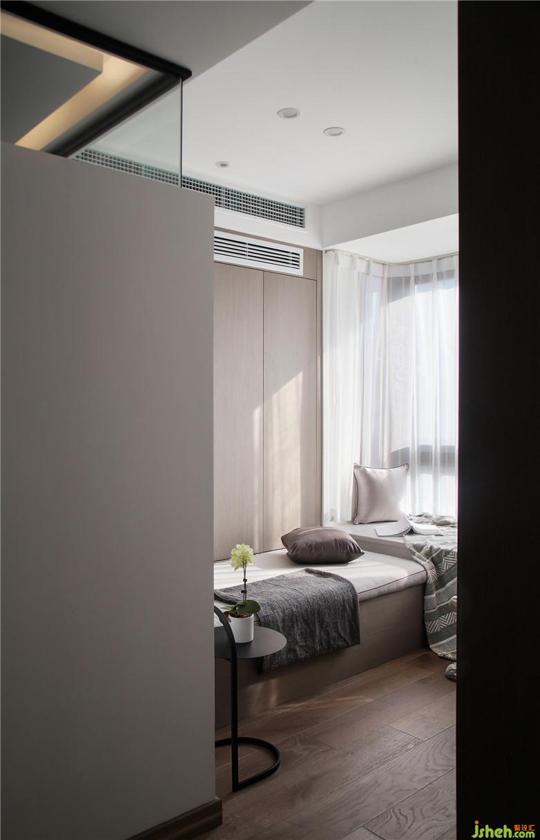 從書房沿著過(guò)道可以看到客廳,此處沒(méi)有設(shè)置門,這樣可以擺脫門的限制,增加屋內(nèi)的通透性。書房與衛(wèi)生間隔墻做了40公分高的玻璃隔斷,很好的將光線引入了衛(wèi)生間內(nèi),使得屋內(nèi)的每一個(gè)房間都明亮通透。