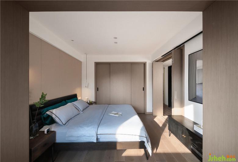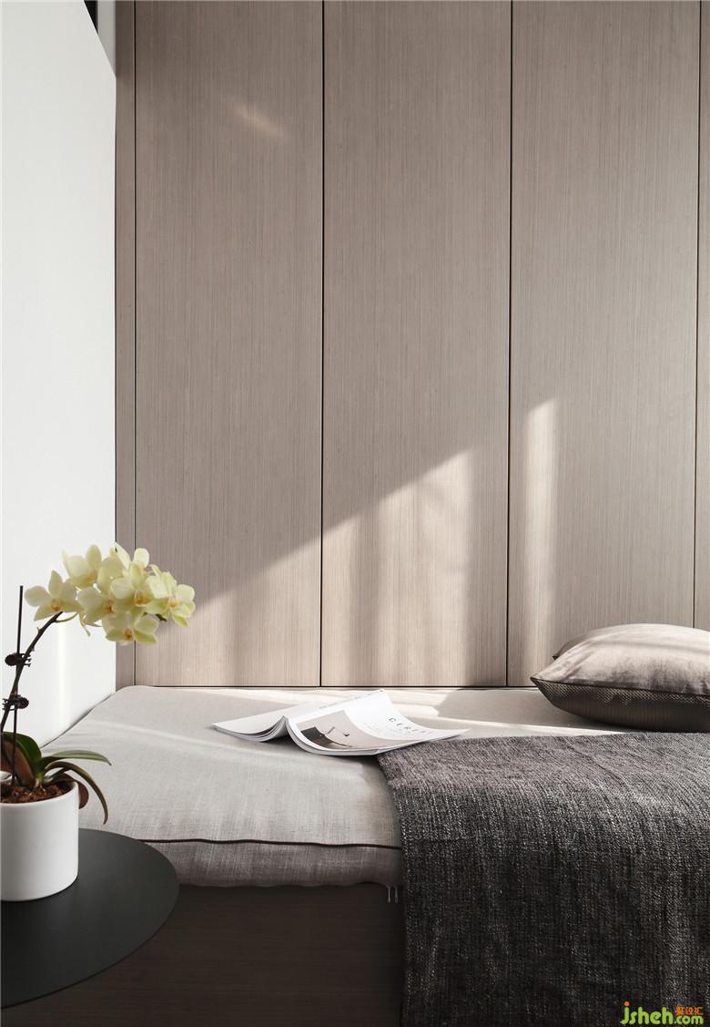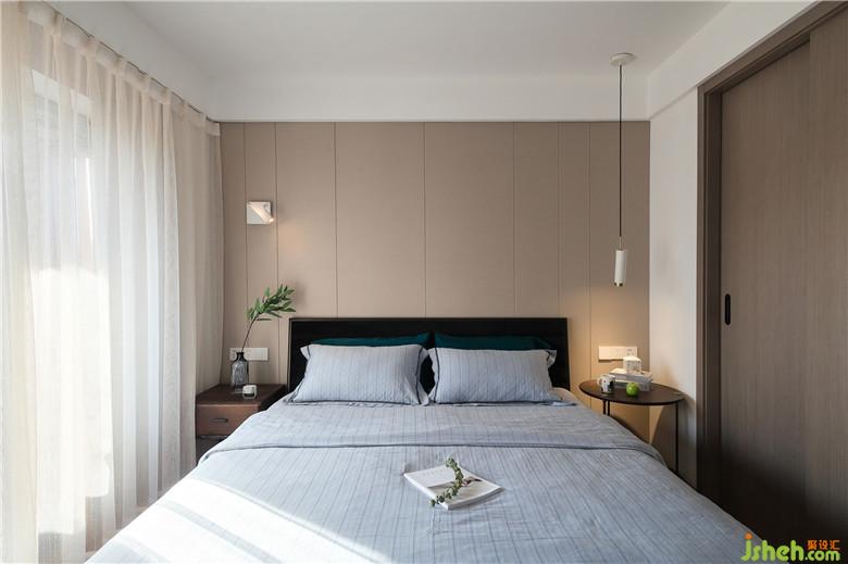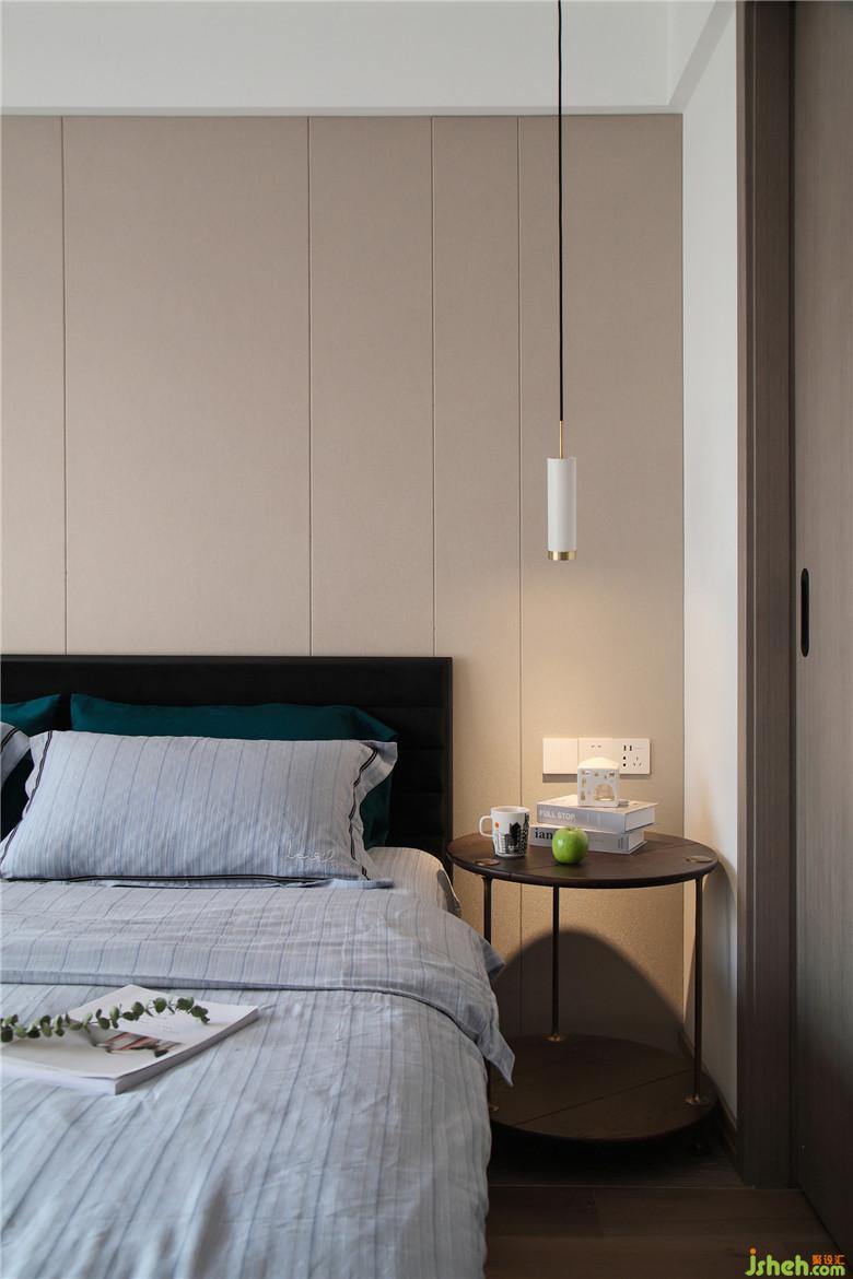 臥室的床頭背景采用了淺咖灰色的硬包,簡(jiǎn)潔柔和,與整屋色調(diào)相一致。床頭靠背配有黑色軟包,倚靠更加舒適,搭上淺藍(lán)色的純棉床品,時(shí)尚且優(yōu)雅,給屋主帶來(lái)舒暢的睡眠體驗(yàn)。