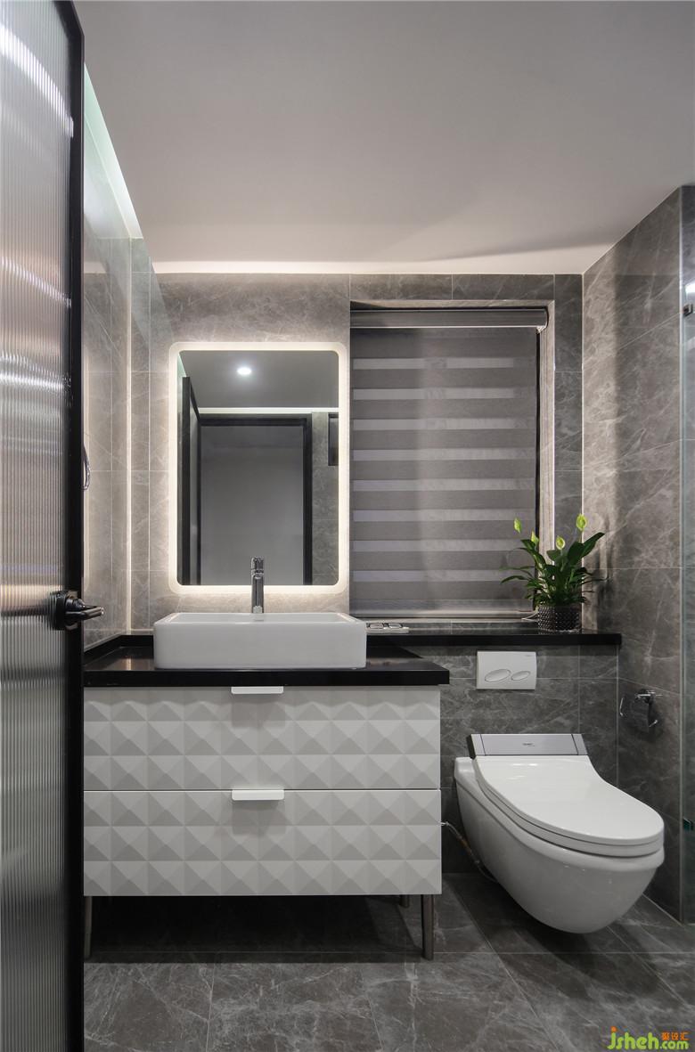 衛(wèi)生間墻地裝修公司鋪設(shè)了同款灰色瓷磚,在對采光改善之后,整體顯得簡單而精致。