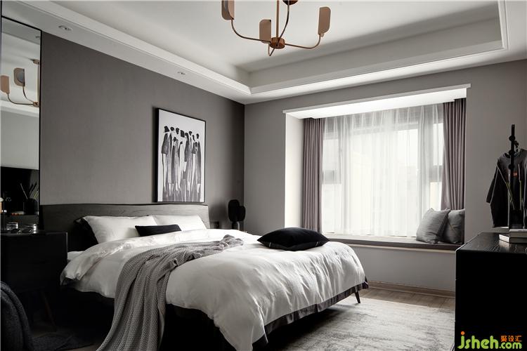 主臥購置了一款黑色的實(shí)木床,配上象牙白的床品,黑白之間散發(fā)出無聲的優(yōu)雅,充滿時(shí)髦韻味。地上搭配了一款淺灰色的地毯,不規(guī)則的漸變色,為空間帶來一份情調(diào)與溫情。