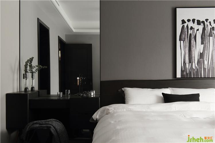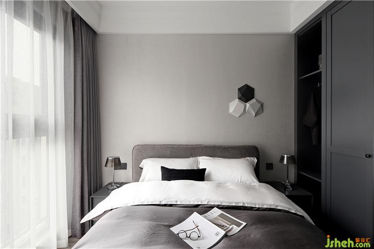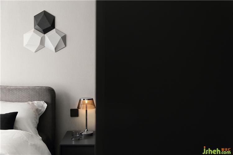 床頭背景墻上裝了一組墻飾,由白灰色、灰色和深灰色3片六角磚組成,立傘式的表面,增加了空間的立體感,又恰巧點(diǎn)綴了墻面。