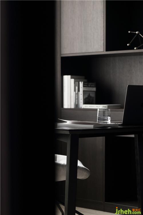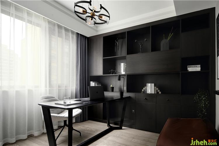 書房定制了黑色的書柜,開放式與封閉式相結(jié)合,可以展示一些自己的收藏品,又可以作為傳統(tǒng)的收納。外觀別致的書桌,顏值與實(shí)用并存;整體以黑色為主色調(diào)的書房散發(fā)出一種迷人的魅力。