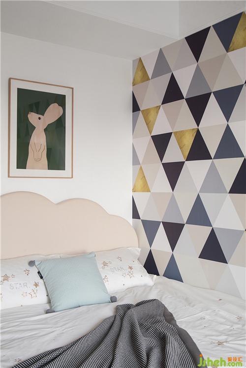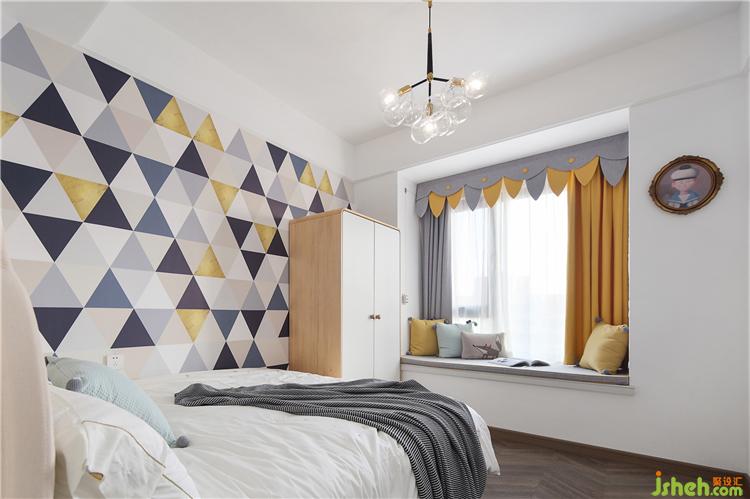 我們在一面墻上定制了多彩的壁紙,三角形+豐富的色彩,可以給孩子帶來更多遐想的空間。房間內(nèi)購置了一款兩門衣柜,采用了弧形元素,圓潤可愛,增加了屋內(nèi)的收納空間。窗簾采用灰色與黃色的搭配,瞬間提亮了空間,增強了視覺感;樹葉狀的造型也增加了屋內(nèi)的趣味性。