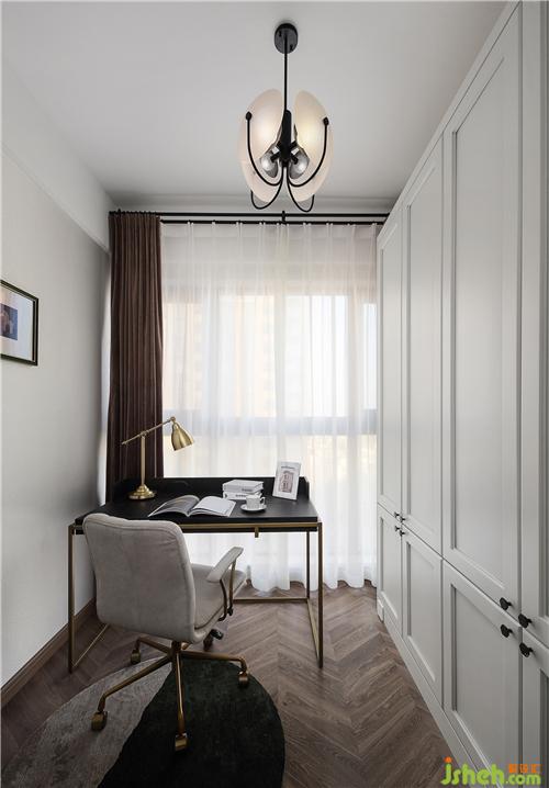 書房的一面墻定制了一排白色的柜子,與整屋色調(diào)統(tǒng)一,大大增加了屋內(nèi)的收納空間。書桌融合了實木與金屬元素,簡約大方;搭配的辦公椅功能齊全,躺靠舒適,優(yōu)雅大氣。地上搭配的圓形地墊,為空間帶來一絲暖意。
