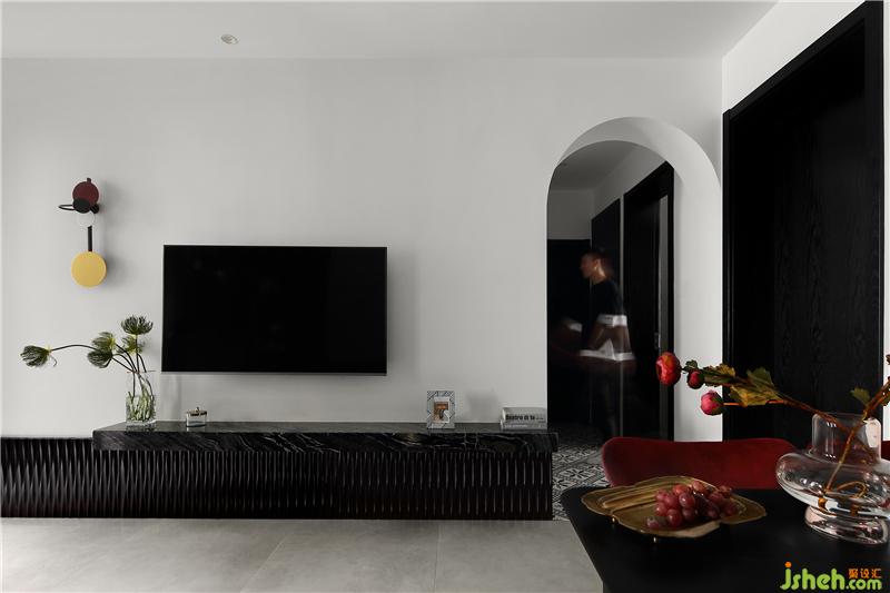 電視背景墻到門廳的墻面上安裝了高度45公分的墻裙,用波浪板定制的,增加了空間的線條感與立體感,時尚美觀,提升了整屋的檔次。嵌在墻上的黑色花紋大理石,懸空設(shè)計看起來十分輕盈,這樣的電視柜簡約又顯得高級感十足,提高了空間的利用率,散發(fā)出別具一格的大氣與內(nèi)斂。室內(nèi)設(shè)計師