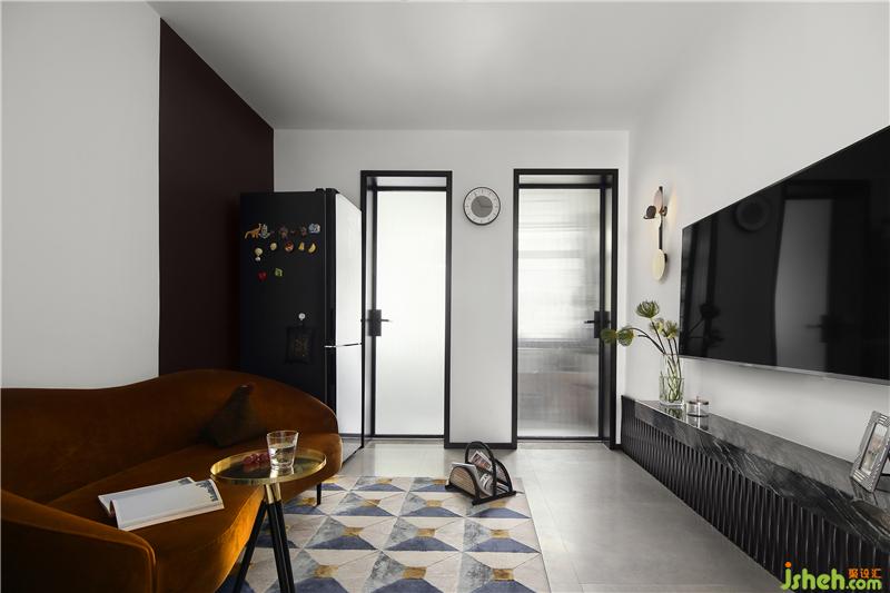 地面配上一塊多彩的幾何地毯,使得整個空間更加溫暖,充滿格調(diào)。地毯一角放上一款輕巧的藤編雜志架,收納幾本愛看的書籍,坐在此處吃點水果零食,也是特別愜意的。廚房和衛(wèi)生間的門都安裝了長虹玻璃,自帶朦朧效果,視覺上可以起到延伸的效果,又可以優(yōu)化室內(nèi)的采光,令空間更顯通透。