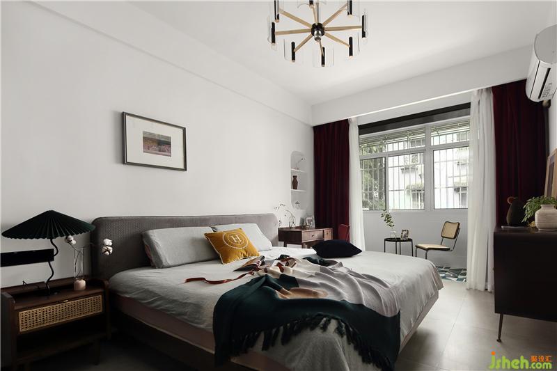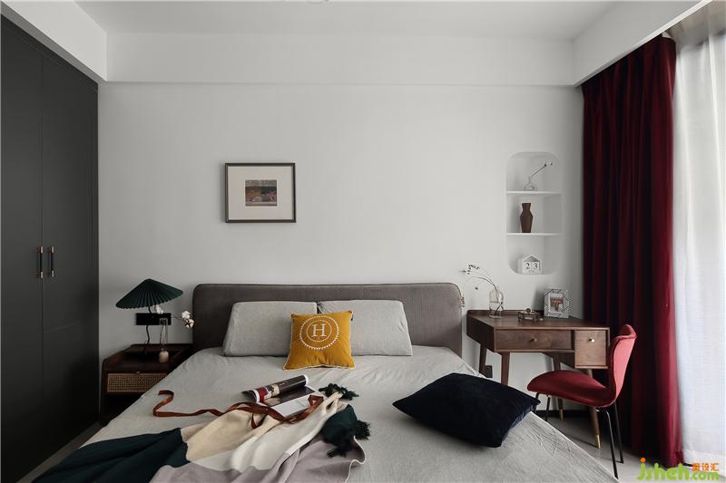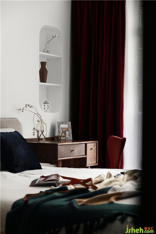 床頭背景墻設(shè)計了一處壁龕,配合兩塊隔板,可形式一定的收納。壁龕洞的外沿四周,似有畫框的感覺,在洞內(nèi)放置上陶制的小花瓶,襯托出一種意境之美。搭配上酒紅色的窗簾,柔和的光線打破了它的沉悶,帶來一絲雅致與清新,更顯酒紅的質(zhì)感。