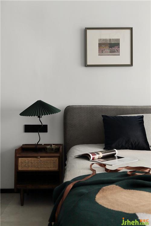 床頭柜帶有時髦又經(jīng)典的復(fù)古調(diào)調(diào),藤面編織的柜面更加耐看,顏值與實用兼具。傘狀的臺燈,線條靈動,充滿設(shè)計感,墨綠色又給臥室?guī)砹艘环轀厍榕c羞澀。