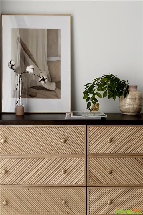 主臥一角購置了一件摩卡色的六斗柜,自然美觀,安靜而溫馨;擺放上一幅裝飾畫,再配以插花和綠植,就成為了臥室里的美麗一角了。