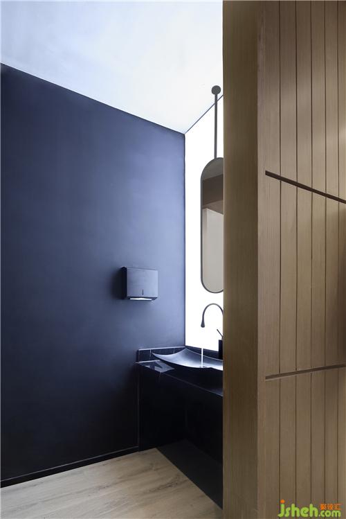 干濕分離的衛(wèi)生間,配色上選用高級(jí)黑,定制的門(mén)上點(diǎn)綴簡(jiǎn)單的造型,兼具質(zhì)感與時(shí)髦感。