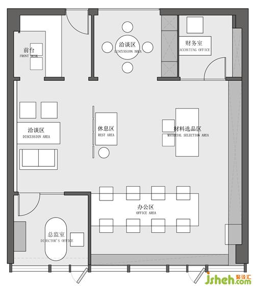 1. 功能上擁有前臺(tái)、洽談區(qū)、軟裝區(qū)、工作區(qū)、總監(jiān)室和財(cái)務(wù)室