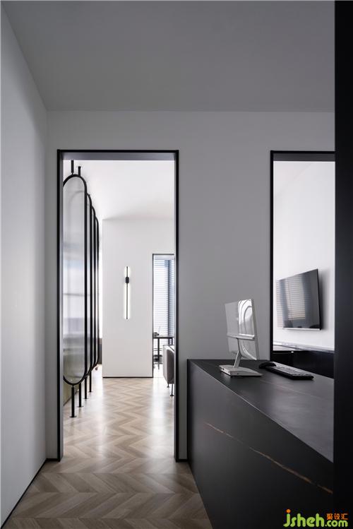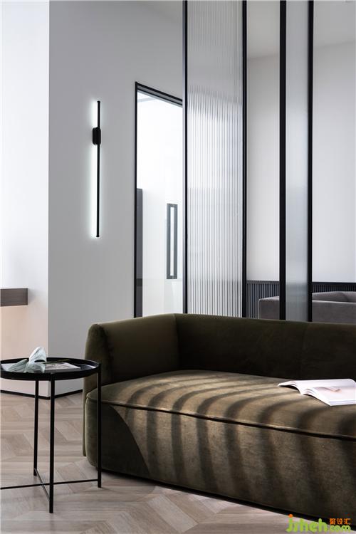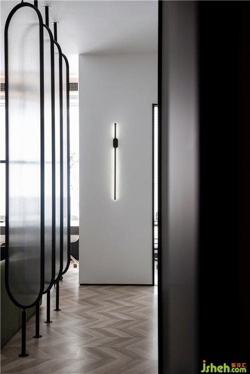進(jìn)入室內(nèi)是一條1.1米寬的過道,埡口做了黑色的包邊,黑白之間更顯精致感。盡頭處的黑色壁燈,看似簡單的幾何圖形,卻富有美感,讓簡約的空間更具現(xiàn)代感。