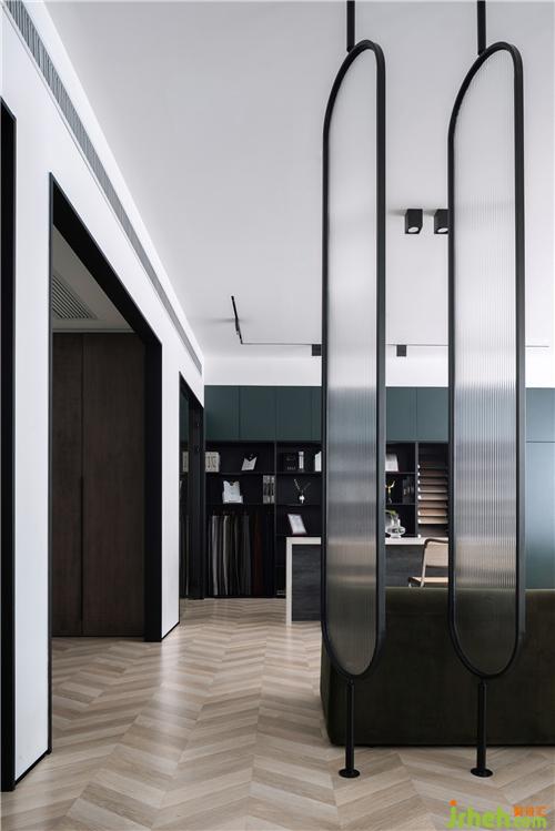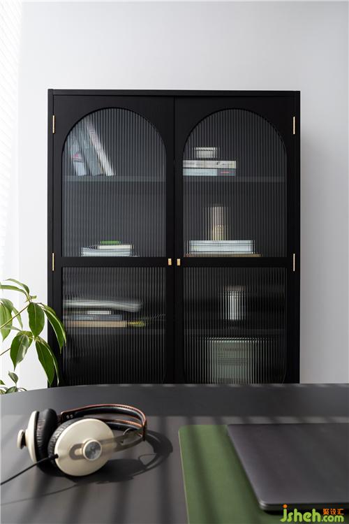摩登復(fù)古的玻璃儲物柜,在光影下呈現(xiàn)若隱若現(xiàn)的視覺美感,集裝飾與收納于一體,給工作空間又增添了一份儀式感。