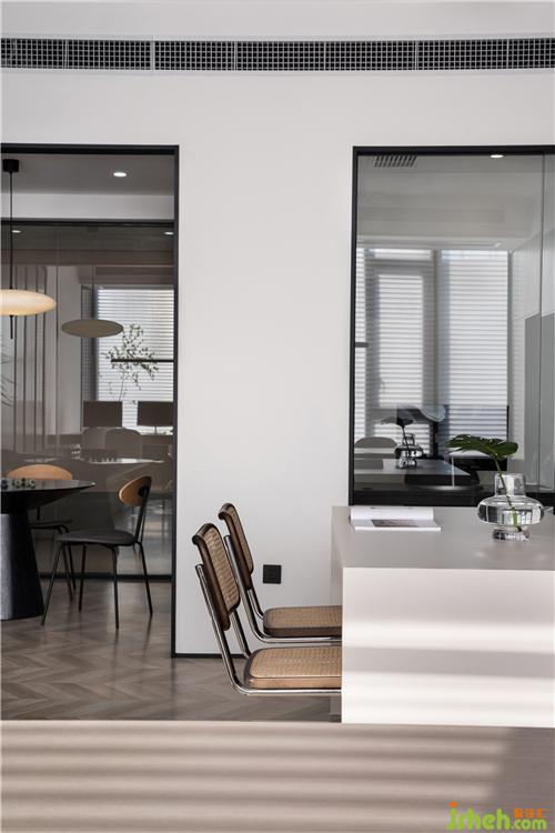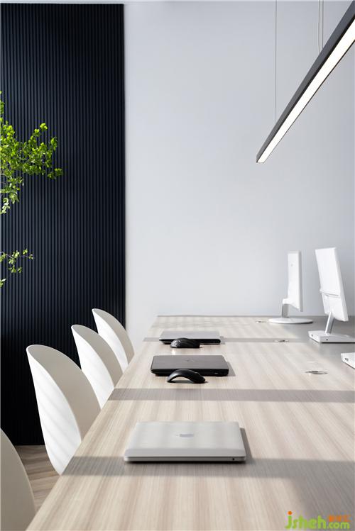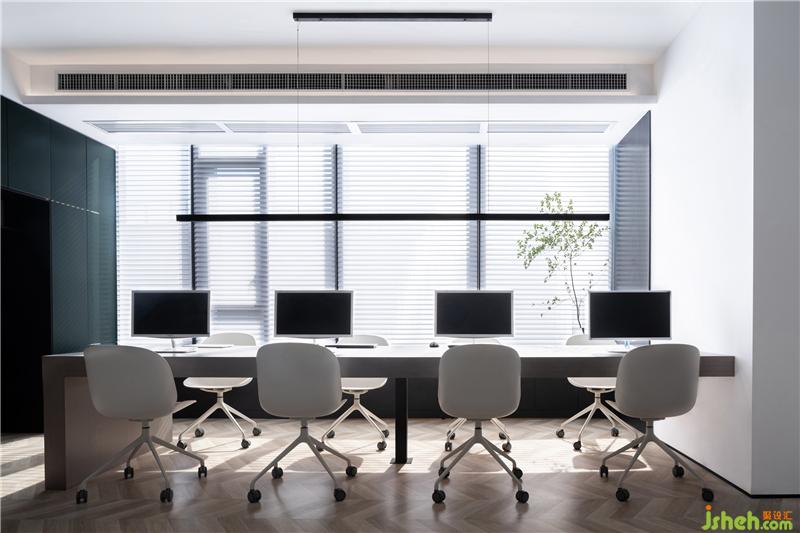 從工作區(qū)可以看到室內(nèi)的全景,公共區(qū)采用了無主燈設(shè)計(jì),視覺上顯得層高更高,光線更加均勻,使得空間簡潔明凈。對面的洽談區(qū)外是透明玻璃,室外走道的光線也可以通透進(jìn)來,增加了視覺的延伸感。