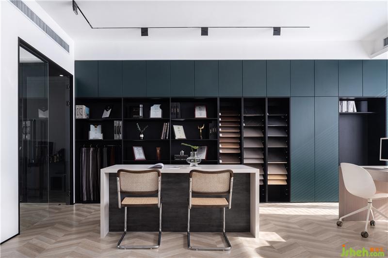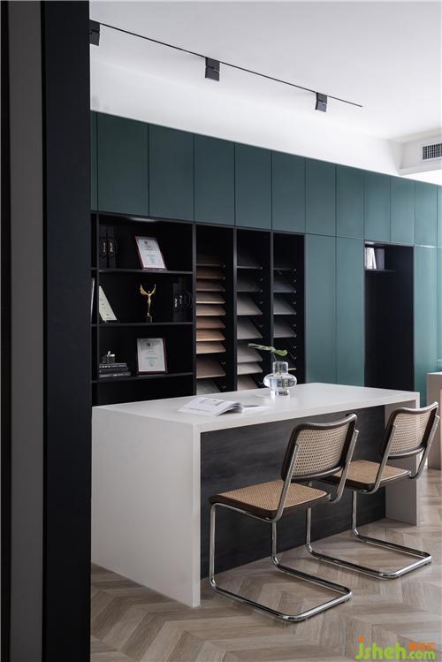 軟裝區(qū)的儲物柜將封閉式與開放式相結(jié)合,既可作為展示,又可以收納;墨綠色與黑色的組合,反而可以放大墨綠色本身自帶的那一股酷酷勁兒,既復(fù)古又高級,給人耳目一新的感覺。頂面安裝了磁吸軌道燈,時尚簡約,南京辦公室設(shè)計(jì)可隨意調(diào)節(jié)燈具位置,提升了空間的格調(diào)。