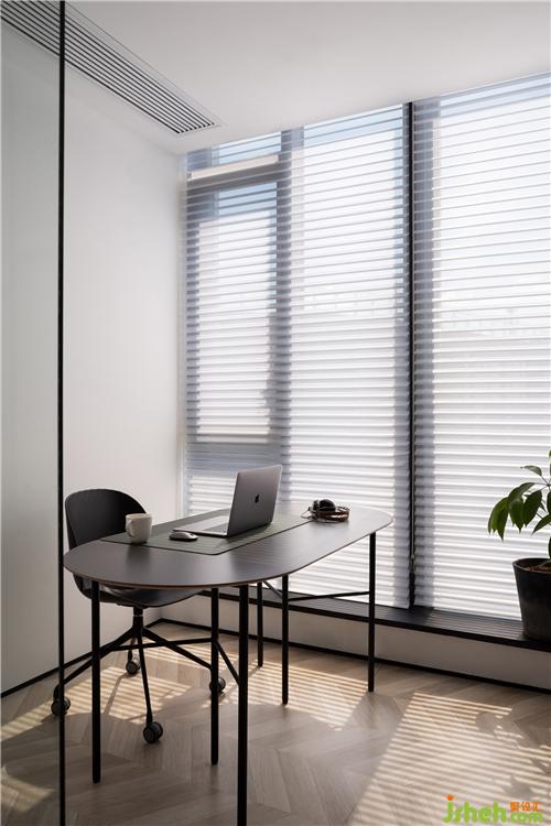 工作區(qū)的窗戶搭配了一款香格里拉簾,外形美觀,可在長時間內(nèi)保持色彩的始終如一,營造出朦朧的窗外景色,既有不錯的裝飾效果,又兼具實(shí)用性,提升了空間的現(xiàn)代感和時尚感。吊燈結(jié)合了簡約的造型與神秘黑的搭配,輕盈而不失高雅,帶來一種感官上的簡約整潔。