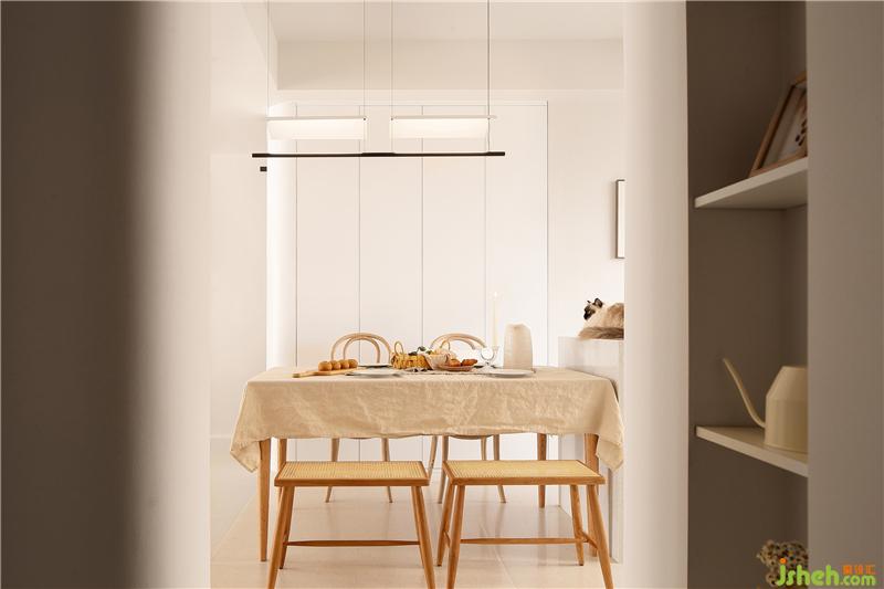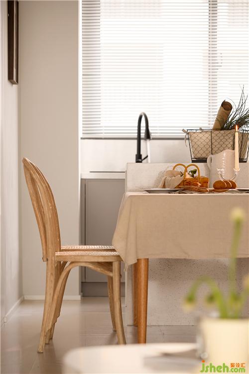 通過玄關(guān)就來到了餐廳,餐廳采用餐桌+兩把靠椅+兩把條凳的組合方式,使空間看起來不死板,沒有靠背的條凳也會更節(jié)省空間。餐桌椅選擇了原木材質(zhì),搭配上藤編的工藝,南京室內(nèi)設(shè)計師自帶一種質(zhì)樸隨和的氣質(zhì),在光線的暈染下,整體散發(fā)出復(fù)古韻味。餐桌鋪上一塊奶咖色的餐布,營造出溫暖、有活力的氛圍,更能增加食欲。餐椅后面的墻體拆除后,定制了一排暖白色的儲物柜,轉(zhuǎn)角處同樣采用了圓弧處理,增加收納的同時又使空間顯得更輕盈明潤。