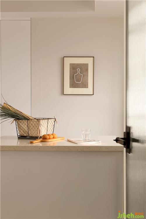 緊鄰餐桌的位置定制了奶咖色的島臺,延伸的臺面可以充當餐桌,備餐端菜,一氣呵成。用餐之余,還能夠作為吧臺、工作臺使用,營造出溫馨活潑的家居氛圍。墻面搭配一幅藝術(shù)掛畫,帶來生活上的一份小美好。