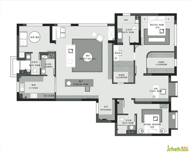 8.客廳與主臥之間的墻體整體優(yōu)化,分別設(shè)計(jì)了公共的衣帽間和化妝間