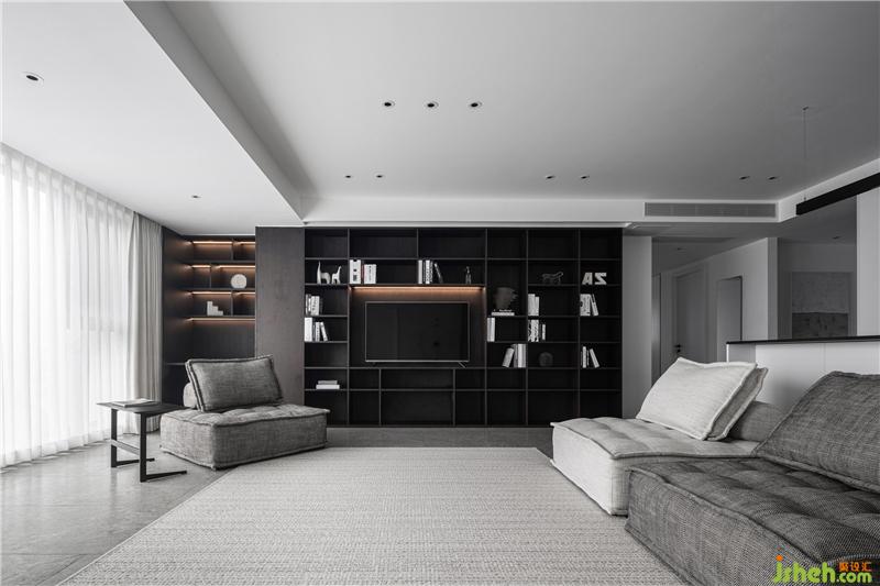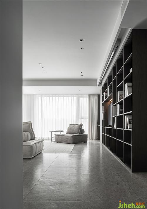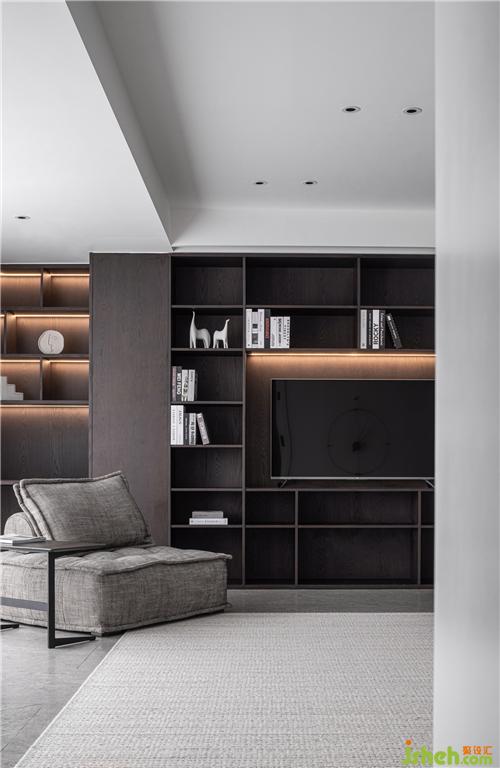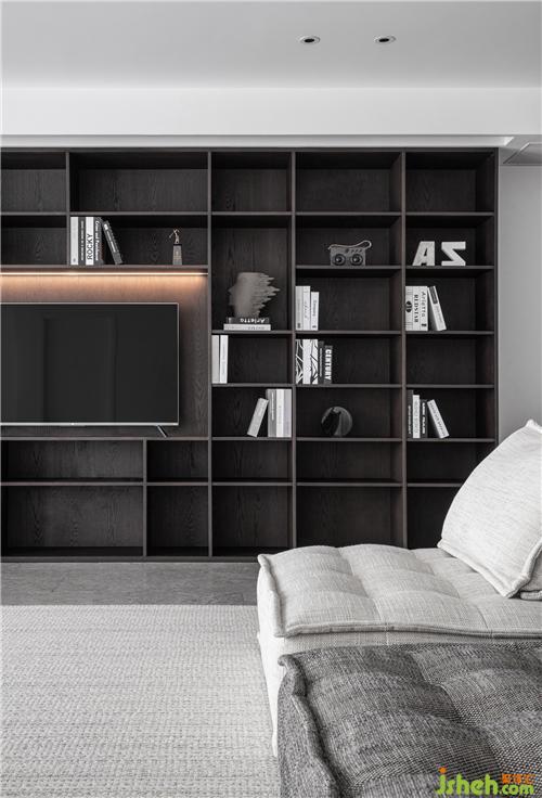 整面的開(kāi)放式書(shū)柜,滿足了屋主愛(ài)看書(shū)的習(xí)慣。將電視內(nèi)嵌于其中,滿足多種功能需求。