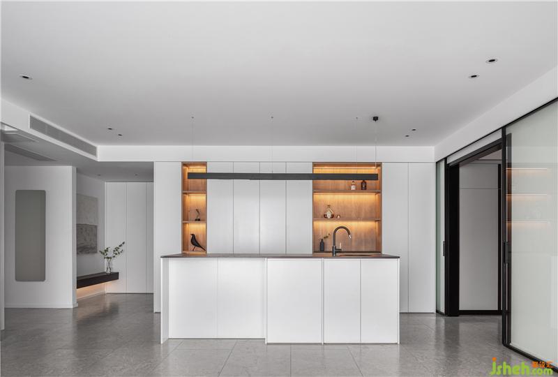 開放式與封閉式結(jié)合的餐邊柜,使得餐廳的組成形式更豐富,實(shí)用性與裝飾性得到了顯著提升;白色與木色的組合,給空間平添一份溫暖、質(zhì)樸,配合上燈帶的效果,豐富了視覺體驗(yàn)的層次感。
