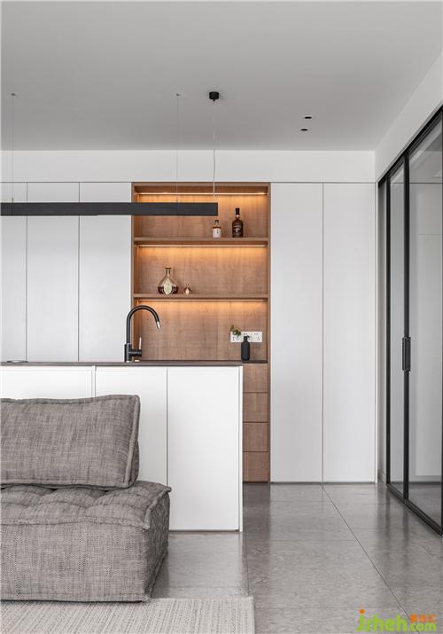 餐廳空間采用了島臺(tái)與吧臺(tái)的結(jié)合,與客廳的氛圍、色彩、材質(zhì)相互搭配,在兼具美感和便利的同時(shí)充分放大社交功能,提升家中的生活品味。帶有水槽的島臺(tái),讓簡單的輕食料理更自如。早餐或者時(shí)間匆忙的時(shí)候,不必大費(fèi)周章的搬到餐桌用餐,吧臺(tái)上就能夠解決,十分方便。在下面設(shè)計(jì)了柜子和置物格,大大提升空間的利用率。